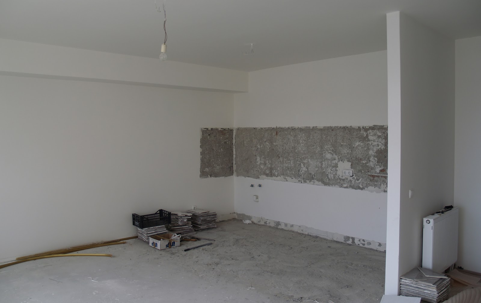 Initial, spatiul destinat bucatariei a fost cam cu 80 cm mai mic, dupa cum se poate observa si din fotografia dinainte de amenajare. Astfel, am mutat peretele separator si caloriferul, pentru a obtine o bucatarie estetica si utila, pe un singur perete. Altfel, ar fi trebuit sa intindem bucataria pe colt si sa invadam spatiul pe care acum il ocupa locul de luat masa. Nu am vrut sa creez nicio separatie in spatiu, pentru ca tocmai deschiderea initiala dadea o senzatie foarte placuta, rar intalnita in apartamente. De altfel, in toate lucrarile noastre, incercam sa deschidem spatiile si sa cream senzatia de spatiu aerisit.