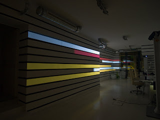 The basic idea was to light up the black and white striped office wall by mapping the architecture with multitple projectors. The program developed by Strukt is scripted in vvvv and is scaleable to any number of projectors and any architectural shape. Several different visualisations have been realised already, amongst it a Pac Man animation as well as moving stripes, and more are in development. The content could also be made interactive, reacting to people passing the ground-floor offices.